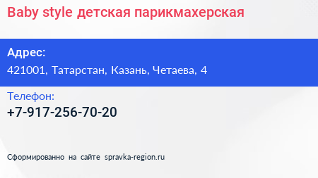 Baby style, детская парикмахерская по адресу 421001, Татарстан, Казань, Четаева, 4 в дальнейшем Организация, размещена в следующих категориях: