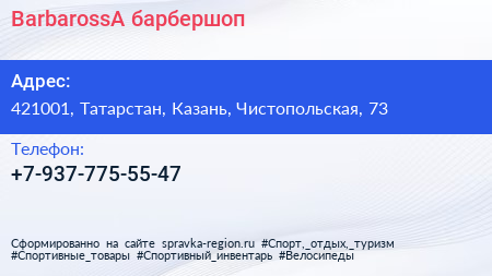 BarbarossA, барбершоп по адресу 421001, Татарстан, Казань, Чистопольская, 73 в дальнейшем Организация, размещена в следующих категориях: