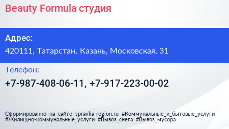 Beauty Formula, студия по адресу 420111, Татарстан, Казань, Московская, 31 в дальнейшем Организация, размещена в следующих категориях: