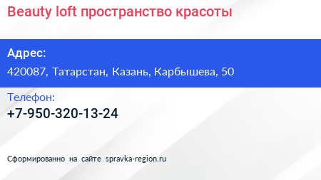 Beauty loft, пространство красоты по адресу 420087, Татарстан, Казань, Карбышева, 50 в дальнейшем Организация, размещена в следующих категориях:
