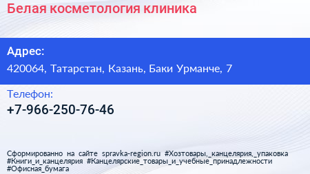 Белая косметология, клиника по адресу 420064, Татарстан, Казань, Баки Урманче, 7 в дальнейшем Организация, размещена в следующих категориях: