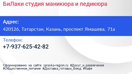 БиЛаки, студия маникюра и педикюра по адресу 420126, Татарстан, Казань, проспект Ямашева, 71а в дальнейшем Организация, размещена в следующих категориях: