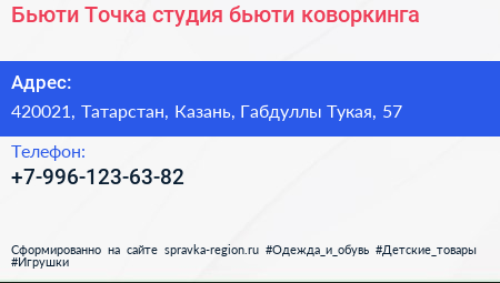 Бьюти Точка, студия бьюти-коворкинга по адресу 420021, Татарстан, Казань, Габдуллы Тукая, 57 в дальнейшем Организация, размещена в следующих категориях: