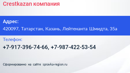 Crestkazan, компания по адресу 420097, Татарстан, Казань, Лейтенанта Шмидта, 35а в дальнейшем Организация, размещена в следующих категориях: