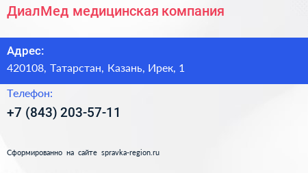ДиалМед, медицинская компания по адресу 420108, Татарстан, Казань, Ирек, 1 в дальнейшем Организация, размещена в следующих категориях: