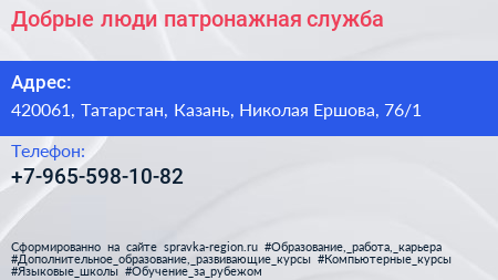 Добрые люди, патронажная служба по адресу 420061, Татарстан, Казань, Николая Ершова, 76/1 в дальнейшем Организация, размещена в следующих категориях: