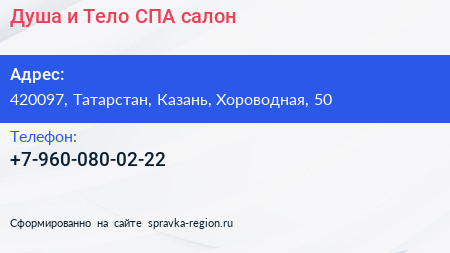 Душа и Тело, СПА-салон по адресу 420097, Татарстан, Казань, Хороводная, 50 в дальнейшем Организация, размещена в следующих категориях: