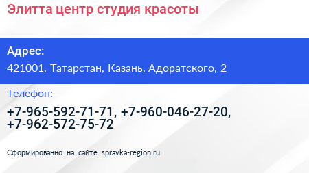 Элитта-центр, студия красоты по адресу 421001, Татарстан, Казань, Адоратского, 2 в дальнейшем Организация, размещена в следующих категориях: