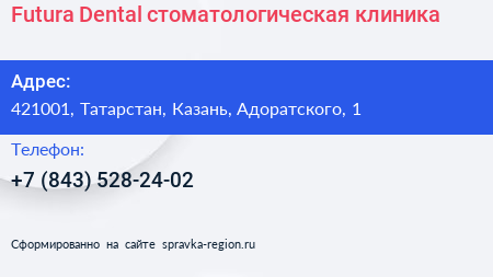 Futura Dental, стоматологическая клиника по адресу 421001, Татарстан, Казань, Адоратского, 1 в дальнейшем Организация, размещена в следующих категориях: