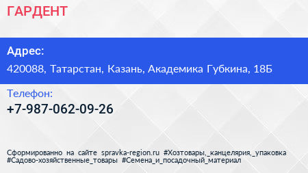 ГАРДЕНТ по адресу 420088, Татарстан, Казань, Академика Губкина, 18Б в дальнейшем Организация, размещена в следующих категориях:
