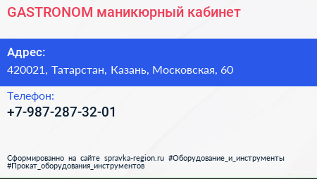 GASTRONOM, маникюрный кабинет по адресу 420021, Татарстан, Казань, Московская, 60 в дальнейшем Организация, размещена в следующих категориях: