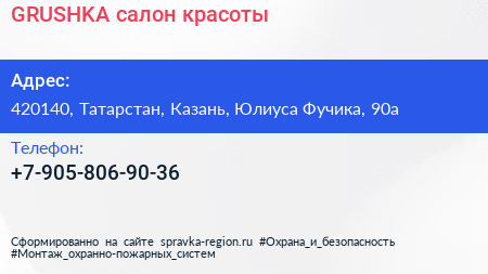 GRUSHKA, салон красоты по адресу 420140, Татарстан, Казань, Юлиуса Фучика, 90а в дальнейшем Организация, размещена в следующих категориях:
