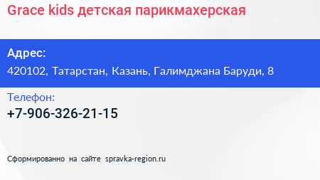 Grace kids, детская парикмахерская по адресу 420102, Татарстан, Казань, Галимджана Баруди, 8 в дальнейшем Организация, размещена в следующих категориях:
