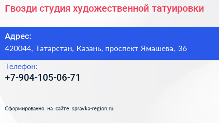 Гвозди, студия художественной татуировки по адресу 420044, Татарстан, Казань, проспект Ямашева, 36 в дальнейшем Организация, размещена в следующих категориях: