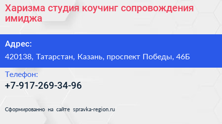 Харизма, студия коучинг-сопровождения имиджа по адресу 420138, Татарстан, Казань, проспект Победы, 46Б в дальнейшем Организация, размещена в следующих категориях: