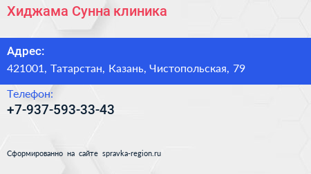 Хиджама Сунна, клиника по адресу 421001, Татарстан, Казань, Чистопольская, 79 в дальнейшем Организация, размещена в следующих категориях: