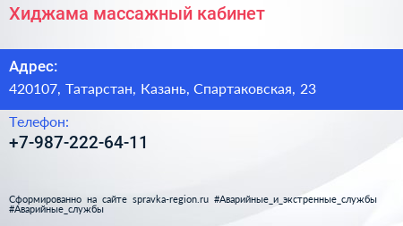 Хиджама, массажный кабинет по адресу 420107, Татарстан, Казань, Спартаковская, 23 в дальнейшем Организация, размещена в следующих категориях: