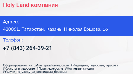 Holy Land, компания по адресу 420061, Татарстан, Казань, Николая Ершова, 16 в дальнейшем Организация, размещена в следующих категориях: