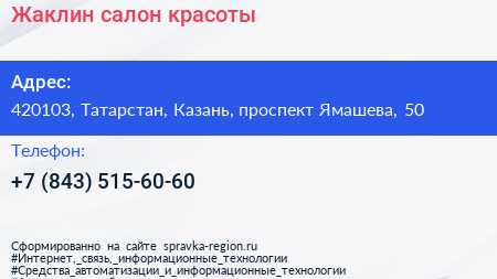 Жаклин, салон красоты по адресу 420103, Татарстан, Казань, проспект Ямашева, 50 в дальнейшем Организация, размещена в следующих категориях: