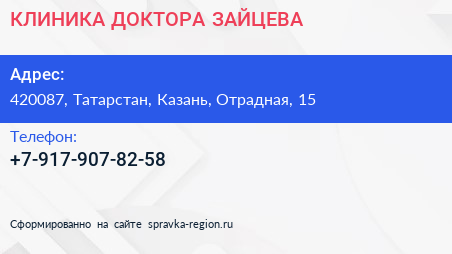 КЛИНИКА ДОКТОРА ЗАЙЦЕВА по адресу 420087, Татарстан, Казань, Отрадная, 15 в дальнейшем Организация, размещена в следующих категориях: