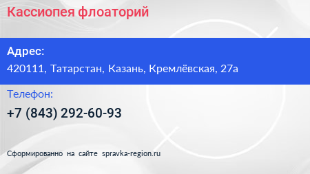 Кассиопея, флоаторий по адресу 420111, Татарстан, Казань, Кремлёвская, 27а в дальнейшем Организация, размещена в следующих категориях: