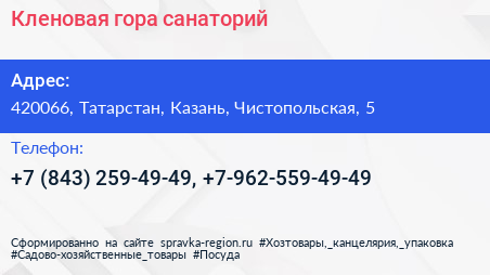 Кленовая гора, санаторий по адресу 420066, Татарстан, Казань, Чистопольская, 5 в дальнейшем Организация, размещена в следующих категориях: