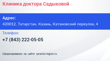 Клиника доктора Садыковой по адресу 420012, Татарстан, Казань, Катановский переулок, 4 в дальнейшем Организация, размещена в следующих категориях: