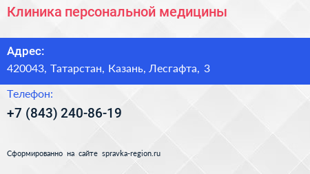 Клиника персональной медицины по адресу 420043, Татарстан, Казань, Лесгафта, 3 в дальнейшем Организация, размещена в следующих категориях: