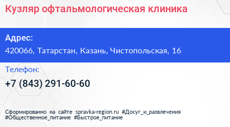 Кузляр, офтальмологическая клиника по адресу 420066, Татарстан, Казань, Чистопольская, 16 в дальнейшем Организация, размещена в следующих категориях: