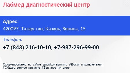 Лабмед, диагностический центр по адресу 420097, Татарстан, Казань, Зинина, 15 в дальнейшем Организация, размещена в следующих категориях: