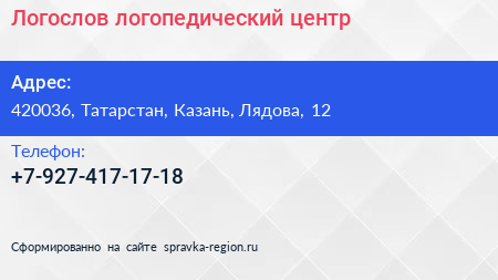 Логослов, логопедический центр по адресу 420036, Татарстан, Казань, Лядова, 12 в дальнейшем Организация, размещена в следующих категориях: