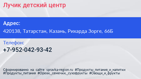 Лучик, детский центр по адресу 420138, Татарстан, Казань, Рихарда Зорге, 66Б в дальнейшем Организация, размещена в следующих категориях: