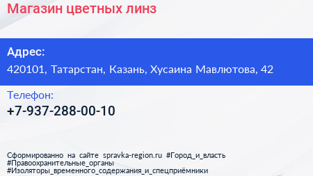 Магазин цветных линз по адресу 420101, Татарстан, Казань, Хусаина Мавлютова, 42 в дальнейшем Организация, размещена в следующих категориях: