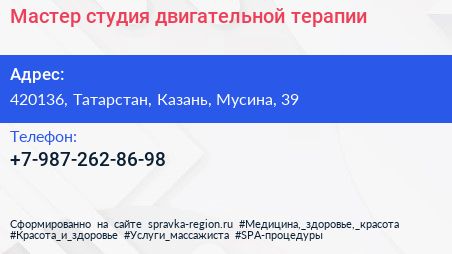 Мастер, студия двигательной терапии по адресу 420136, Татарстан, Казань, Мусина, 39 в дальнейшем Организация, размещена в следующих категориях: