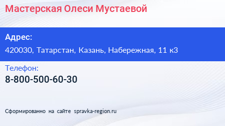 Мастерская Олеси Мустаевой по адресу 420030, Татарстан, Казань, Набережная, 11 к3 в дальнейшем Организация, размещена в следующих категориях: