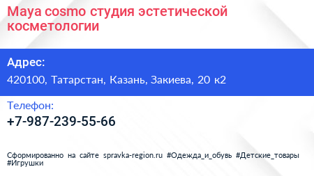 Maya cosmo, студия эстетической косметологии по адресу 420100, Татарстан, Казань, Закиева, 20 к2 в дальнейшем Организация, размещена в следующих категориях: