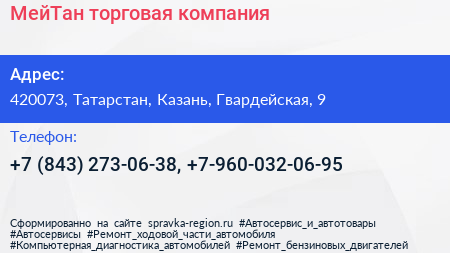 МейТан, торговая компания по адресу 420073, Татарстан, Казань, Гвардейская, 9 в дальнейшем Организация, размещена в следующих категориях: