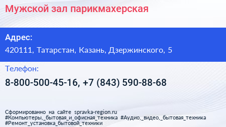 Мужской зал, парикмахерская по адресу 420111, Татарстан, Казань, Дзержинского, 5 в дальнейшем Организация, размещена в следующих категориях: