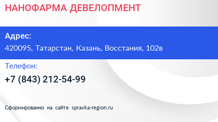 НАНОФАРМА ДЕВЕЛОПМЕНТ по адресу 420095, Татарстан, Казань, Восстания, 102в в дальнейшем Организация, размещена в следующих категориях:
