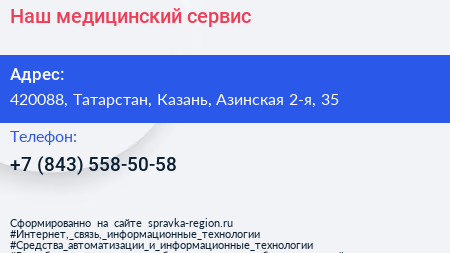 Наш медицинский сервис по адресу 420088, Татарстан, Казань, Азинская 2-я, 35 в дальнейшем Организация, размещена в следующих категориях:
