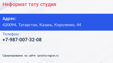 Неформат, тату-студия по адресу 420094, Татарстан, Казань, Короленко, 44 в дальнейшем Организация, размещена в следующих категориях: