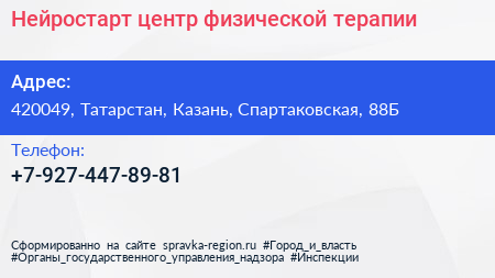Нейростарт, центр физической терапии по адресу 420049, Татарстан, Казань, Спартаковская, 88Б в дальнейшем Организация, размещена в следующих категориях: