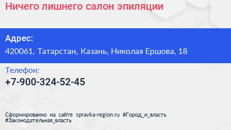Ничего лишнего, салон эпиляции по адресу 420061, Татарстан, Казань, Николая Ершова, 18 в дальнейшем Организация, размещена в следующих категориях: