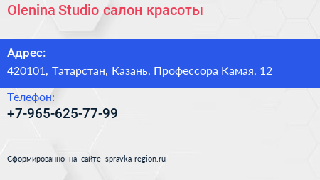 Olenina Studio, салон красоты по адресу 420101, Татарстан, Казань, Профессора Камая, 12 в дальнейшем Организация, размещена в следующих категориях: