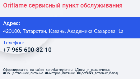 Oriflame, сервисный пункт обслуживания по адресу 420100, Татарстан, Казань, Академика Сахарова, 1а в дальнейшем Организация, размещена в следующих категориях: