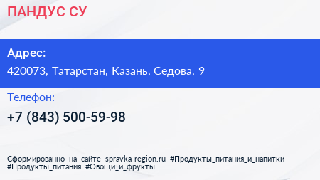 ПАНДУС.СУ по адресу 420073, Татарстан, Казань, Седова, 9 в дальнейшем Организация, размещена в следующих категориях: