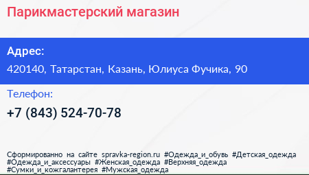 Парикмастерский магазин по адресу 420140, Татарстан, Казань, Юлиуса Фучика, 90 в дальнейшем Организация, размещена в следующих категориях: