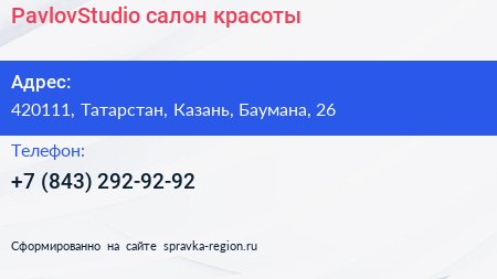 PavlovStudio, салон красоты по адресу 420111, Татарстан, Казань, Баумана, 26 в дальнейшем Организация, размещена в следующих категориях: