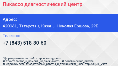 Пикассо, диагностический центр по адресу 420061, Татарстан, Казань, Николая Ершова, 29Б в дальнейшем Организация, размещена в следующих категориях: