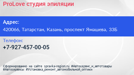 ProLove, студия эпиляции по адресу 420066, Татарстан, Казань, проспект Ямашева, 33Б в дальнейшем Организация, размещена в следующих категориях: